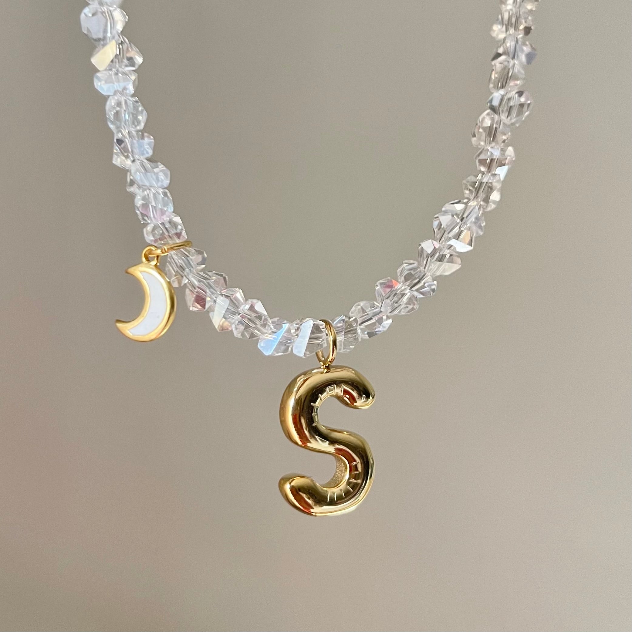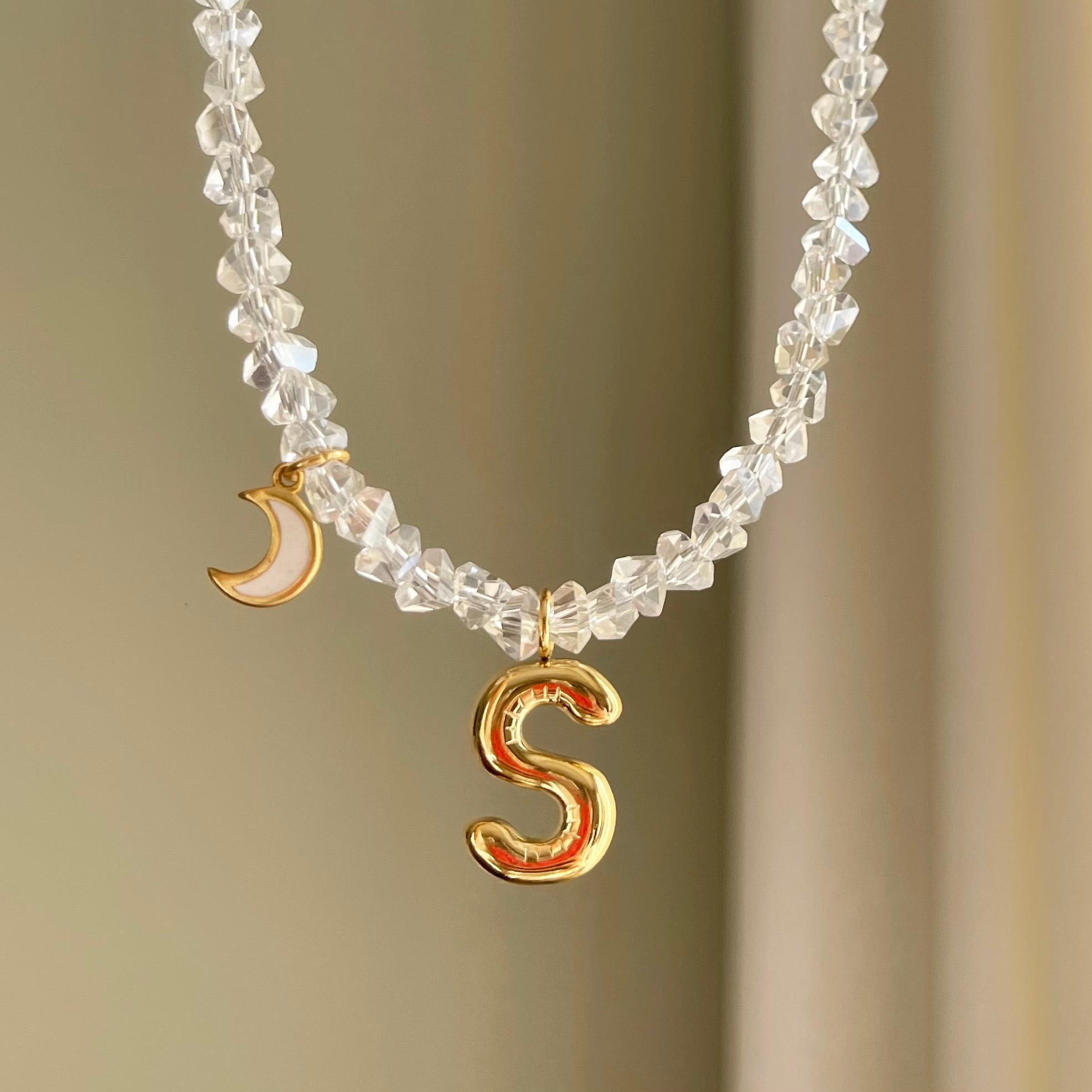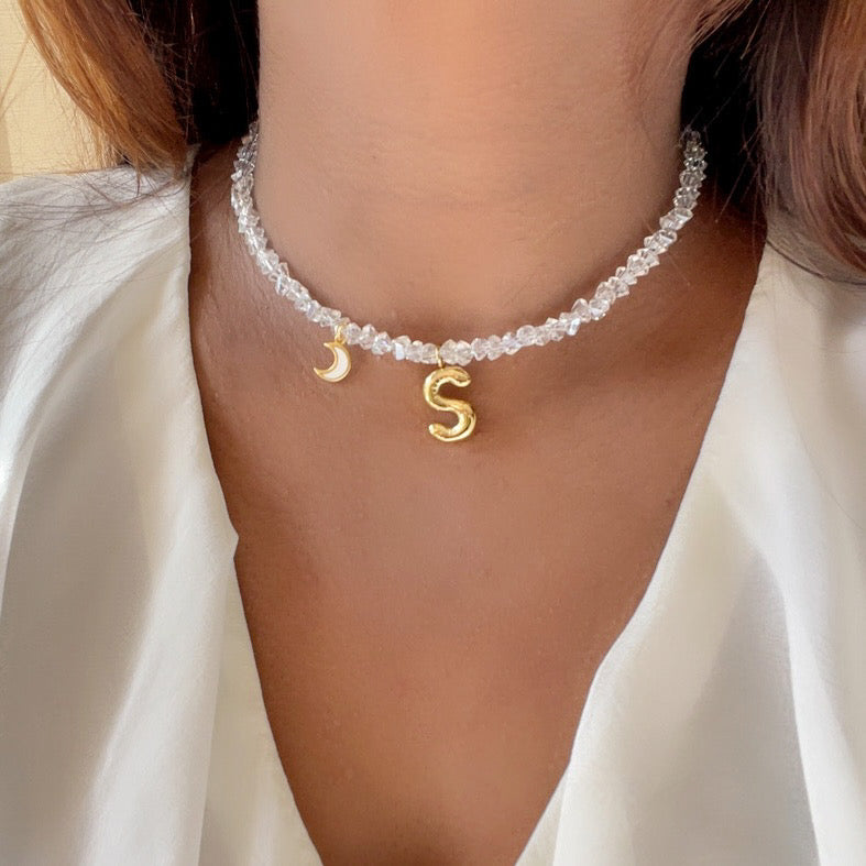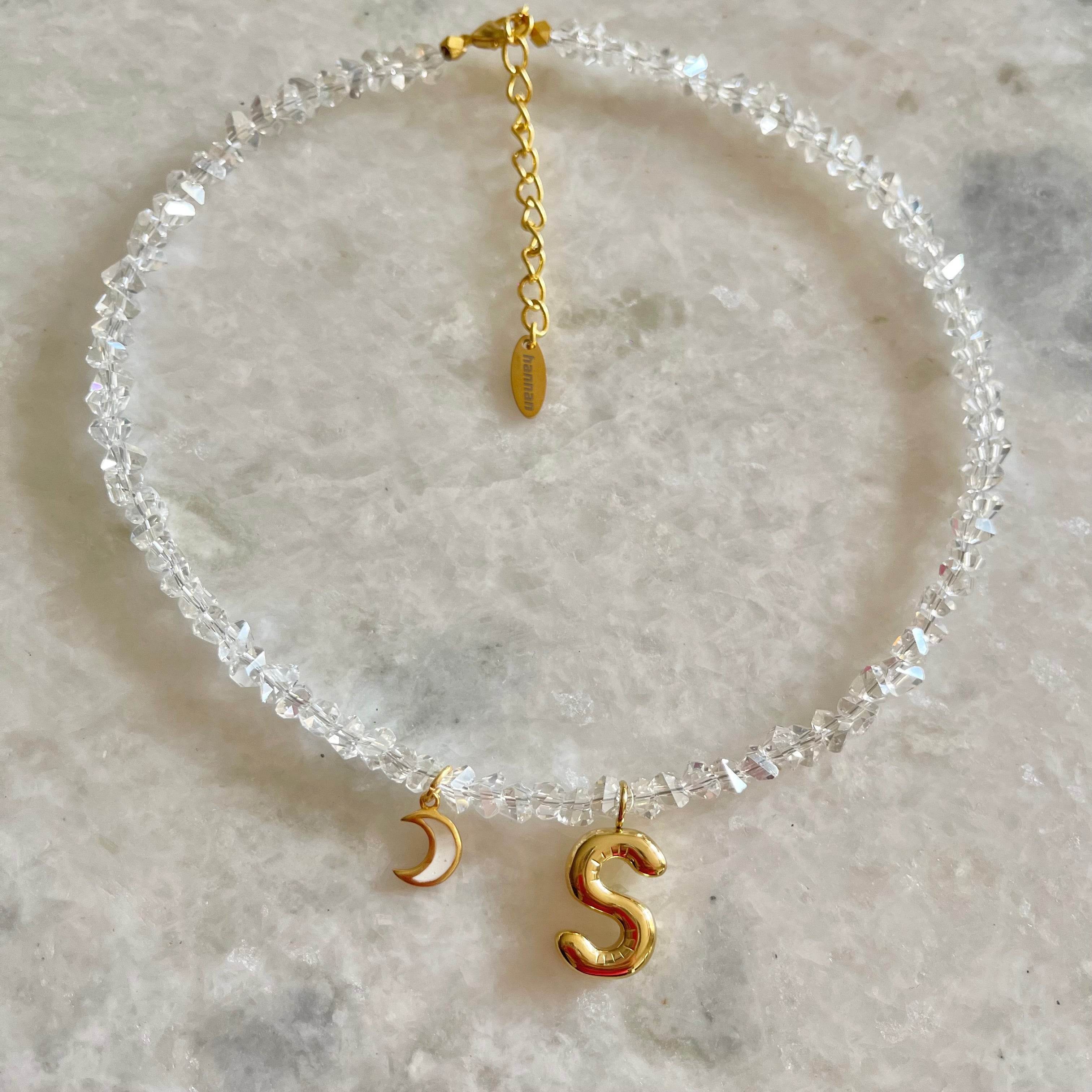 HANNAN balloon letter charm and an ivory enamelled crescent moon charm, on an amorphous-cut crystals necklace.