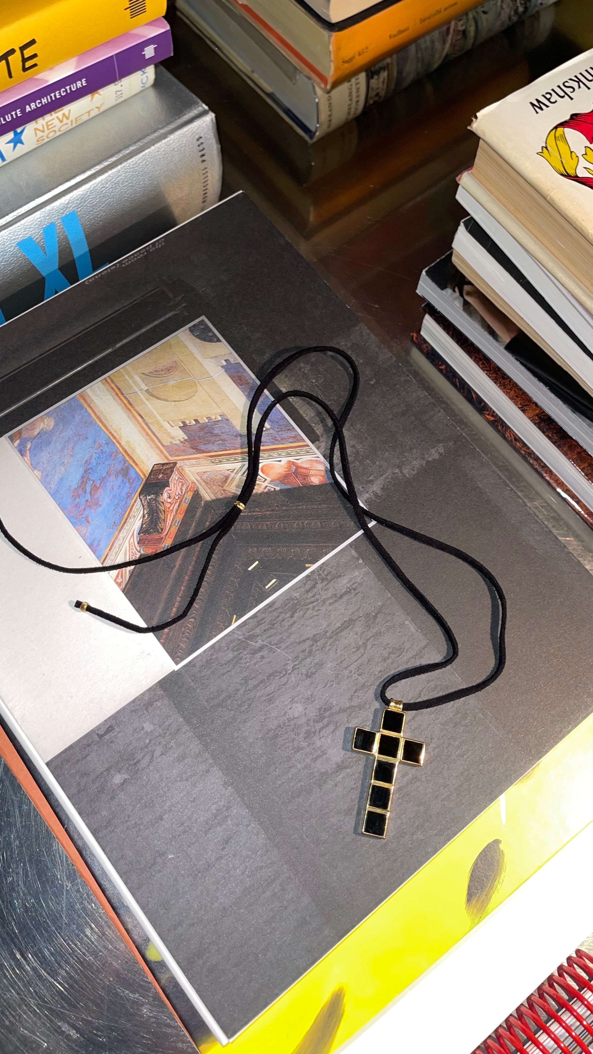 Soft suede adjustable length cord necklace with the signature HANNAN cross charm with black onyx gemstones.