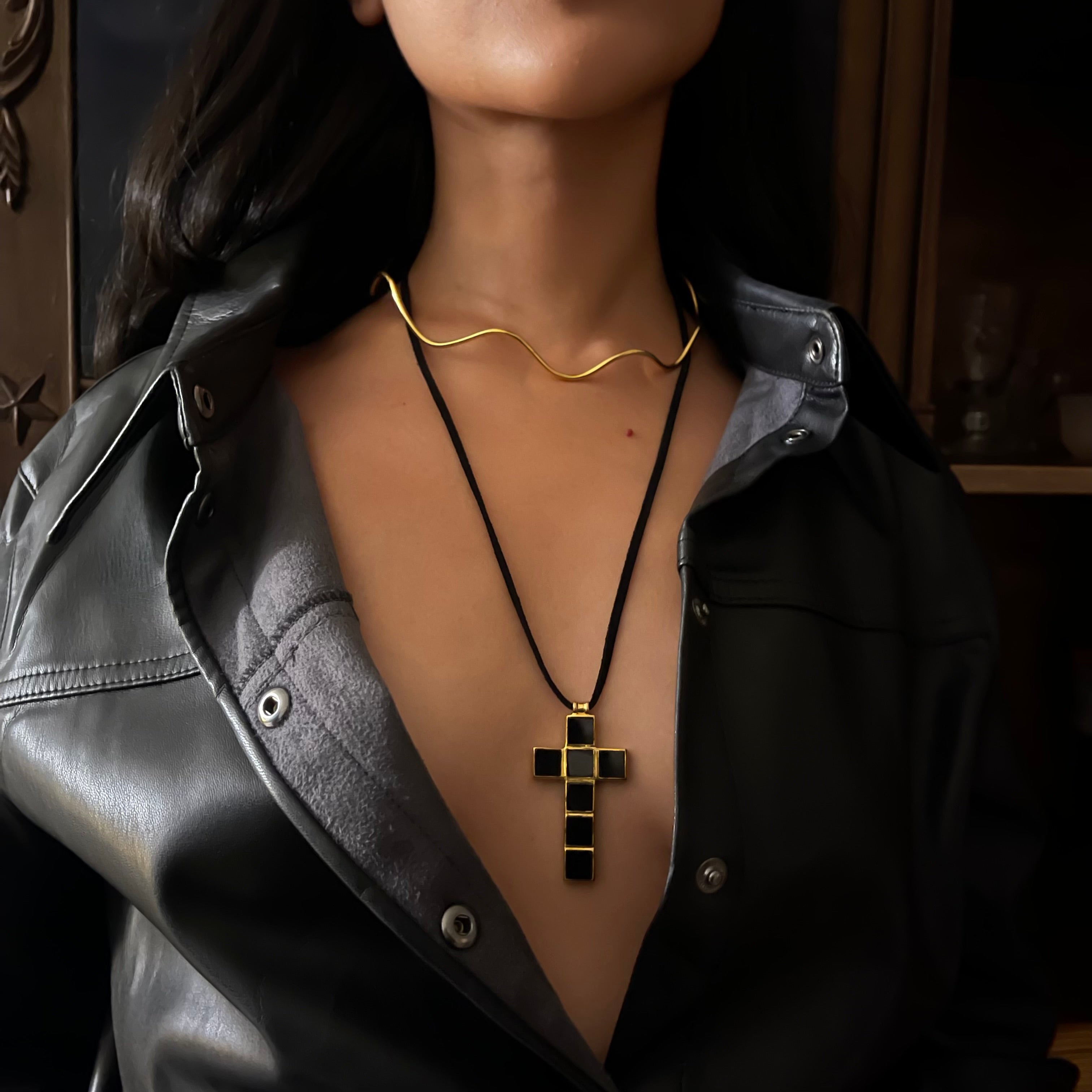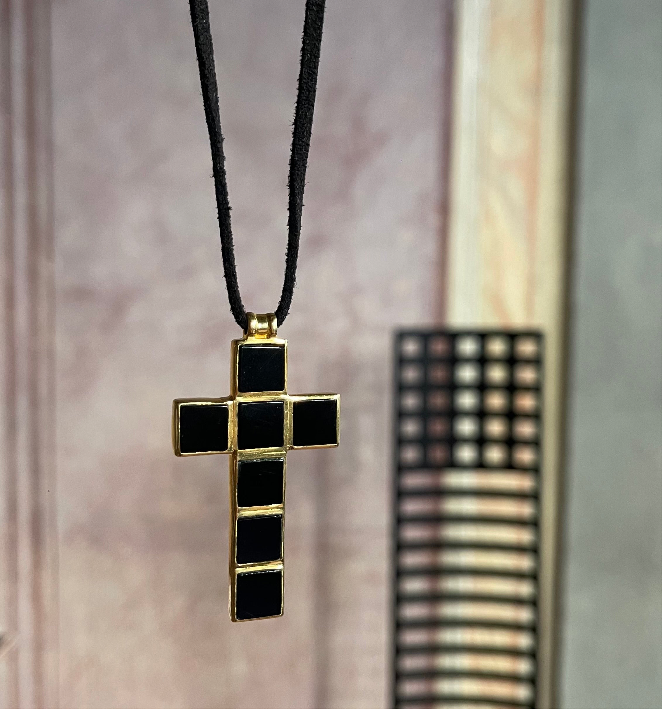 - approx 3" Cross charm with black onyx square gemstones, in 18k gold-plated brass.
