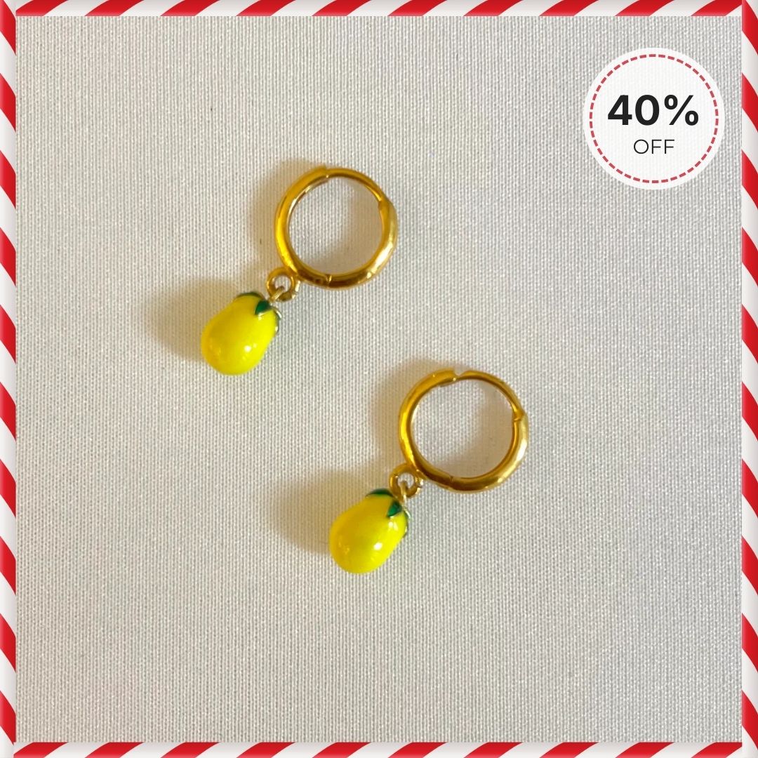 HANNAN 1/2" huggie hoops with enamelled lemon charms dangling free.