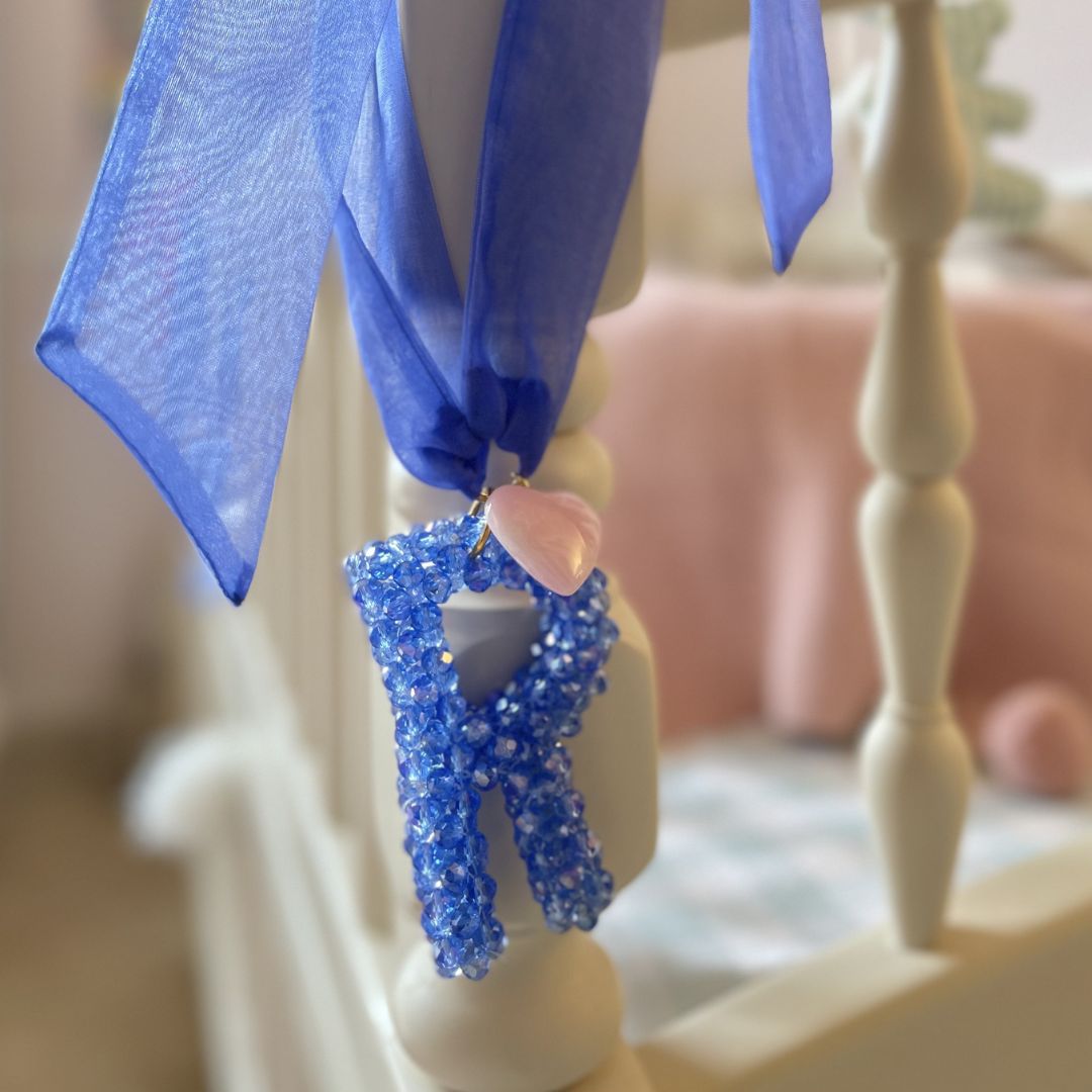 Hand-beaded Initial in soft crystal periwinkle blue beads with a HANNAN signature heart charm in lilac.