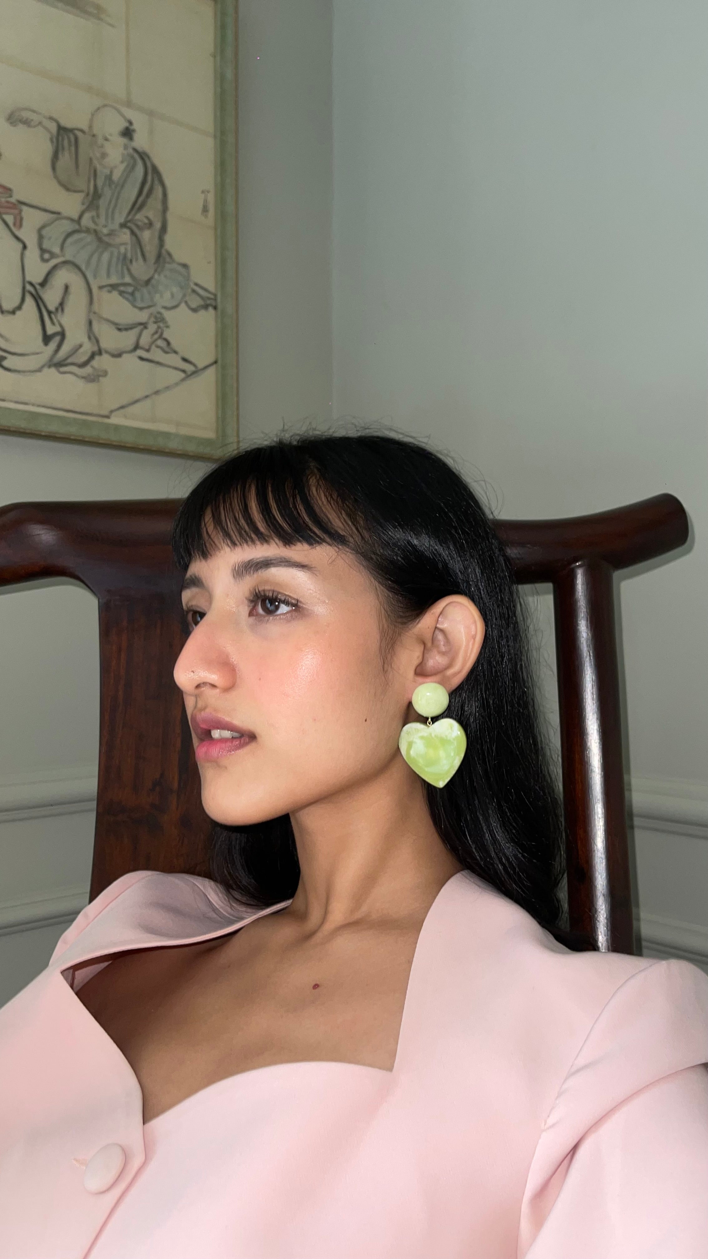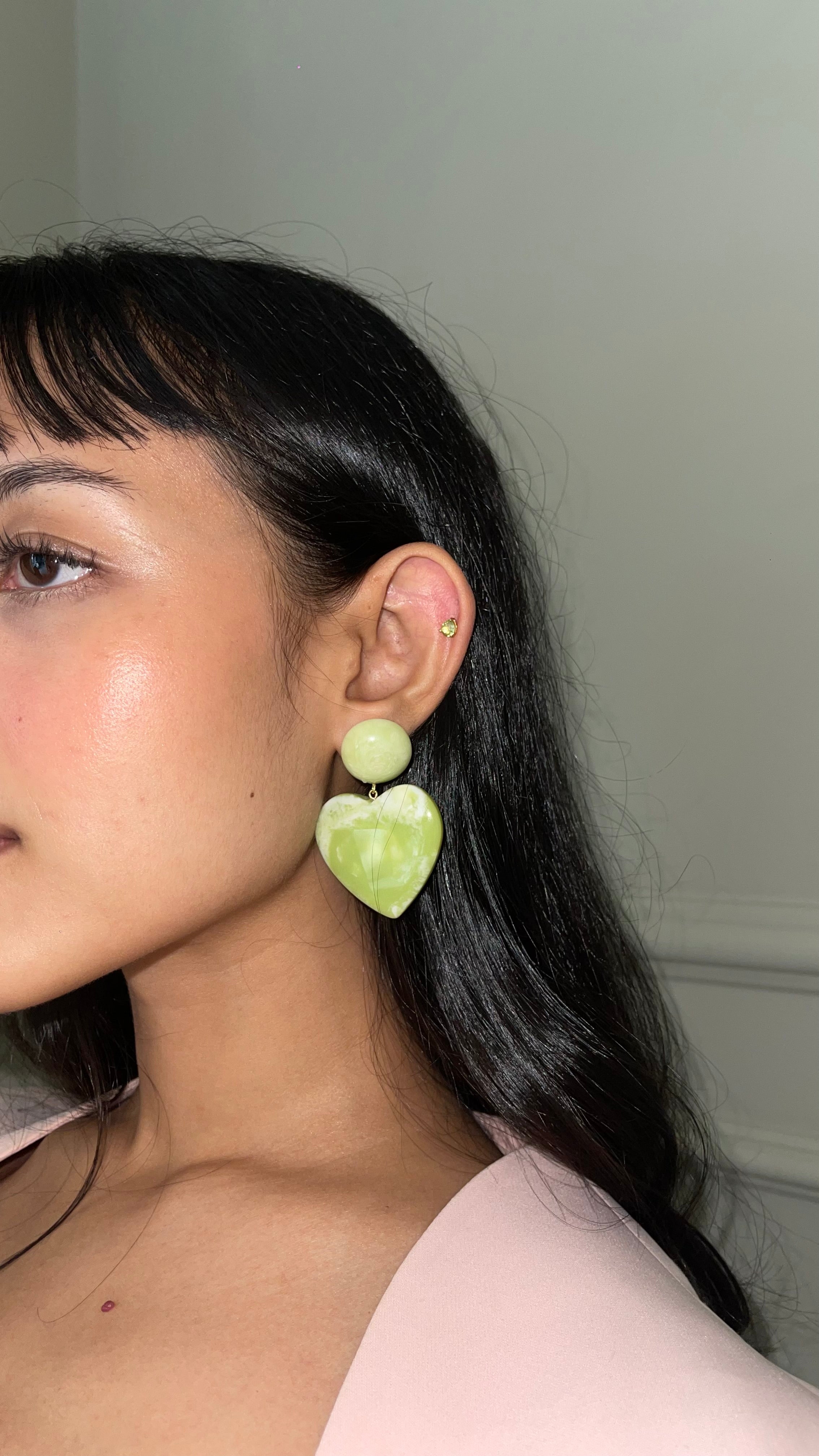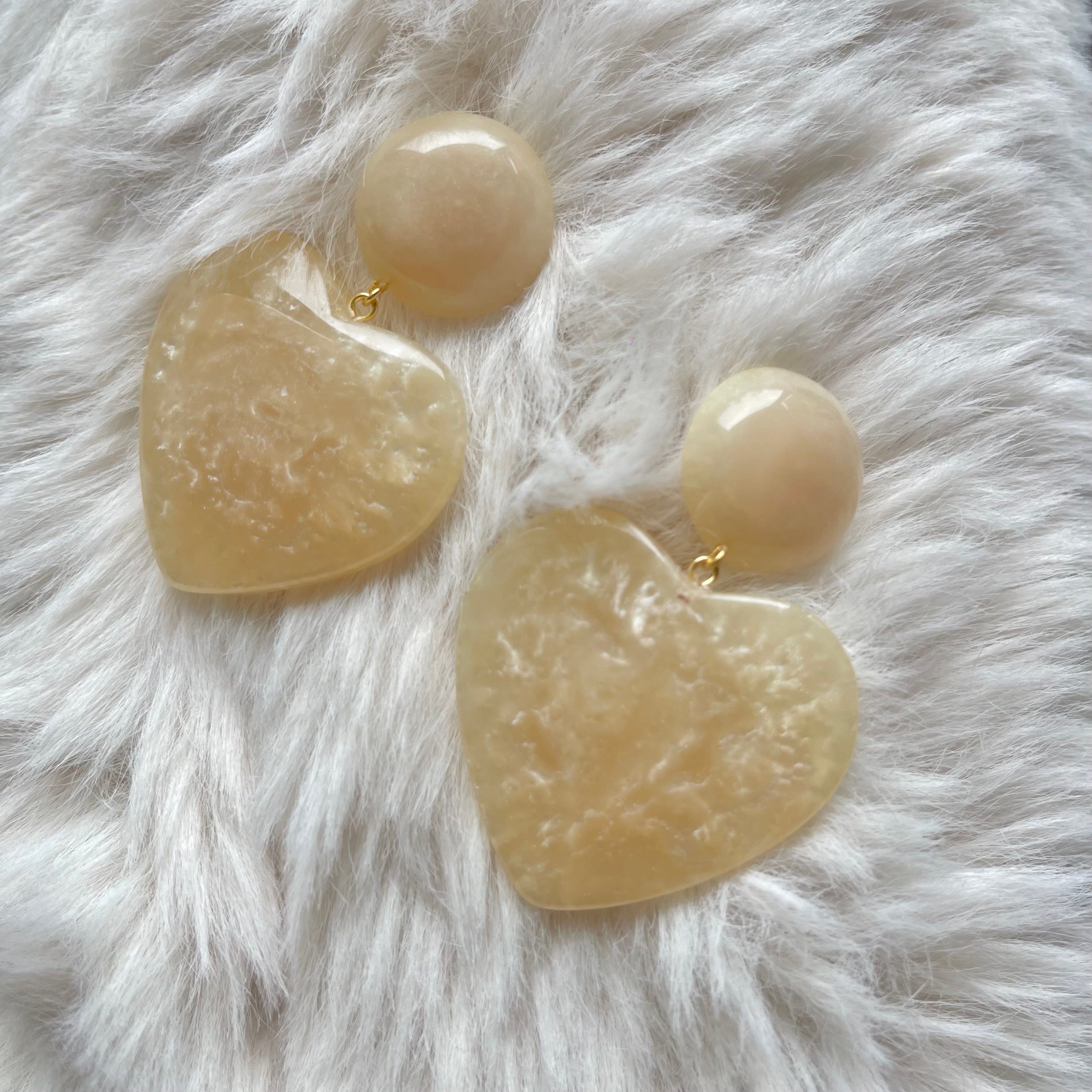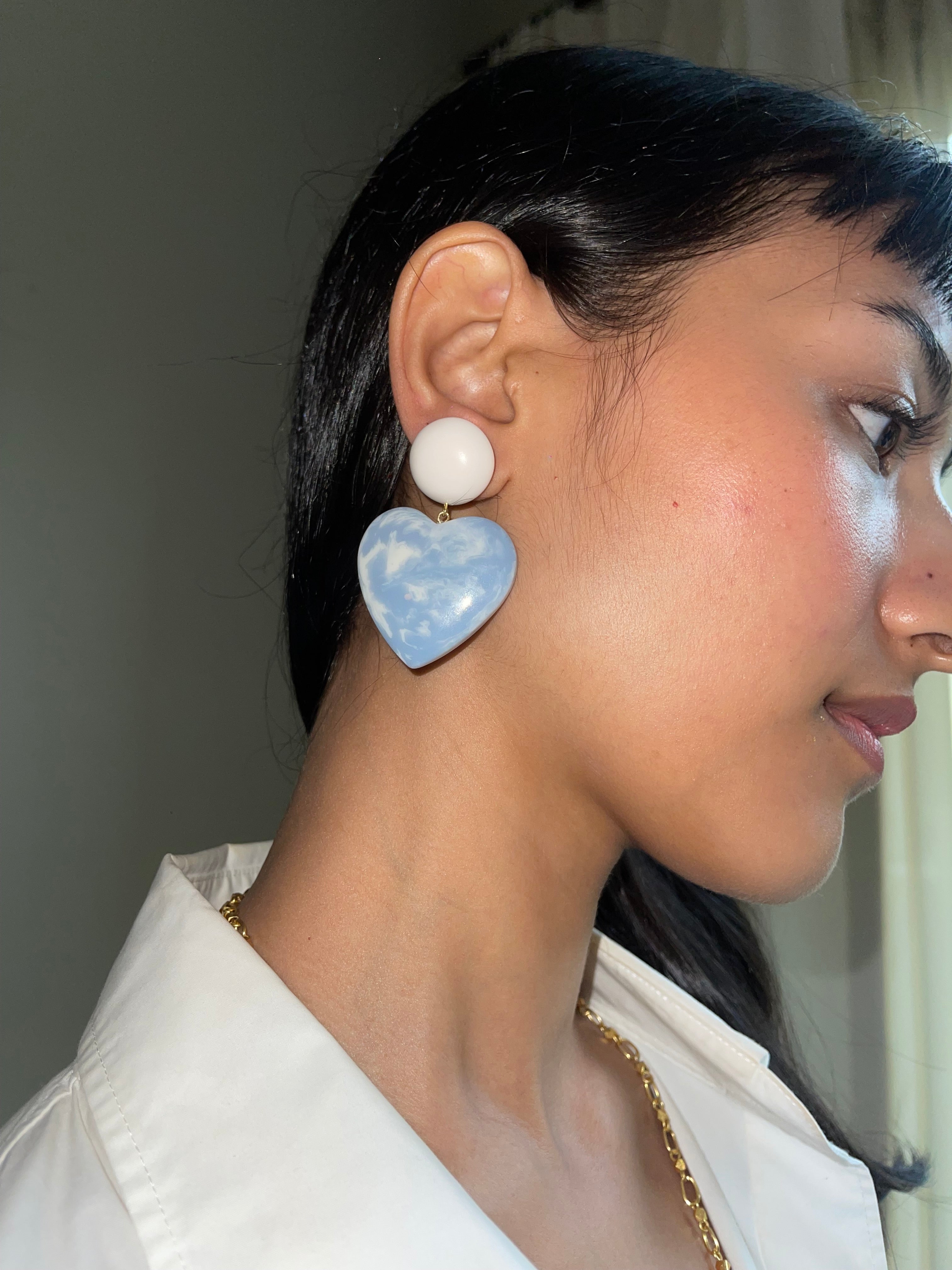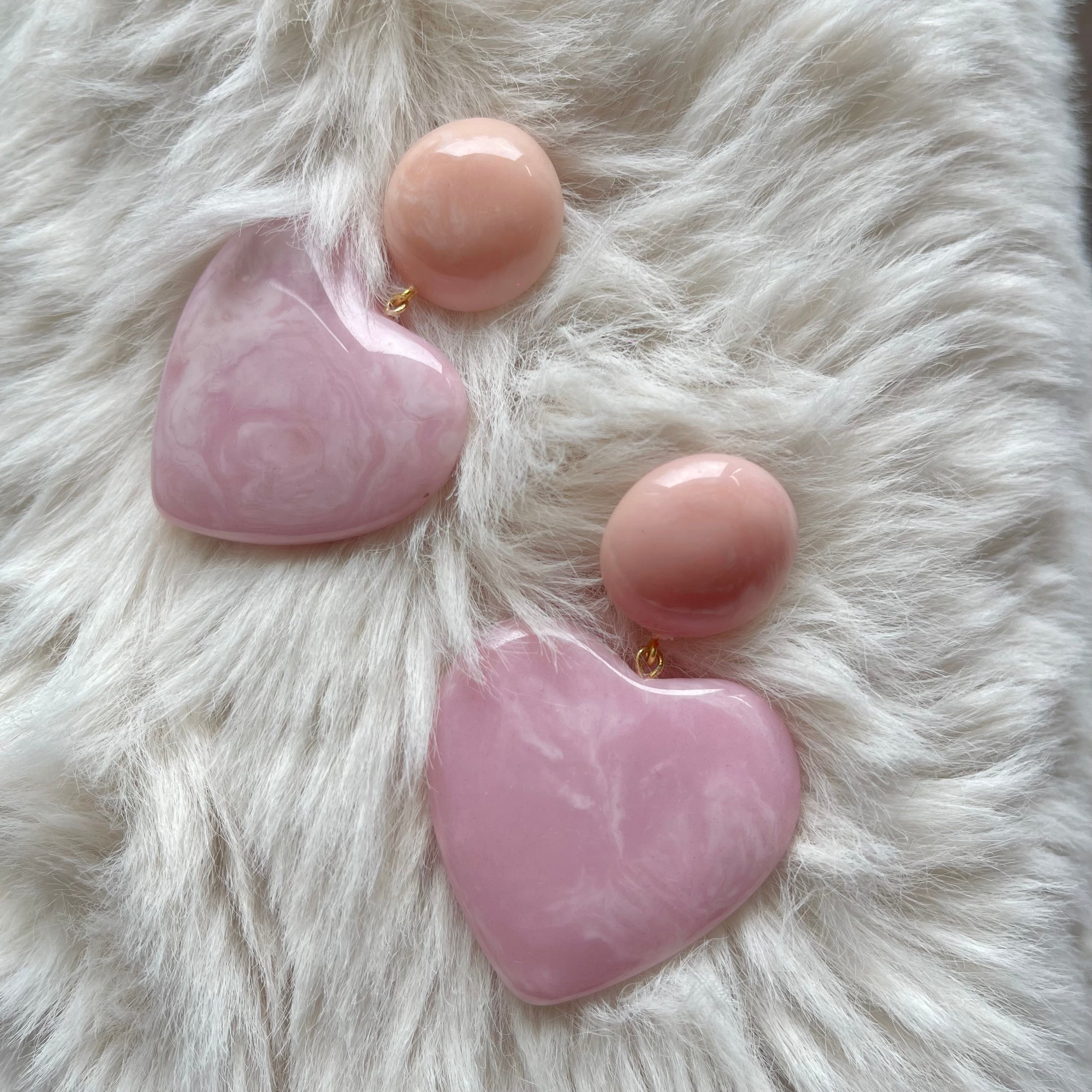Signature statement dangler earrings with swirl resin button studs and 1.5” max hearts.