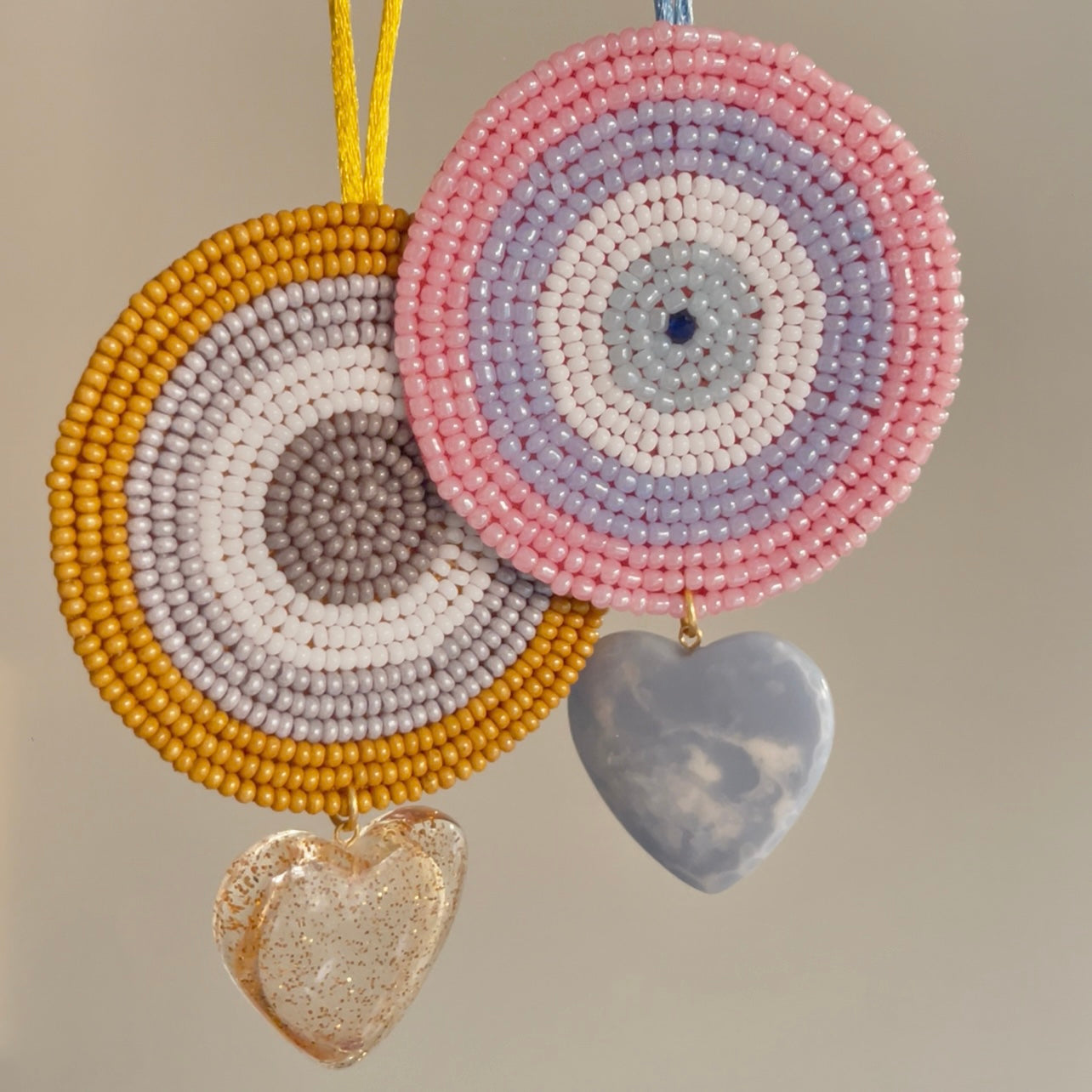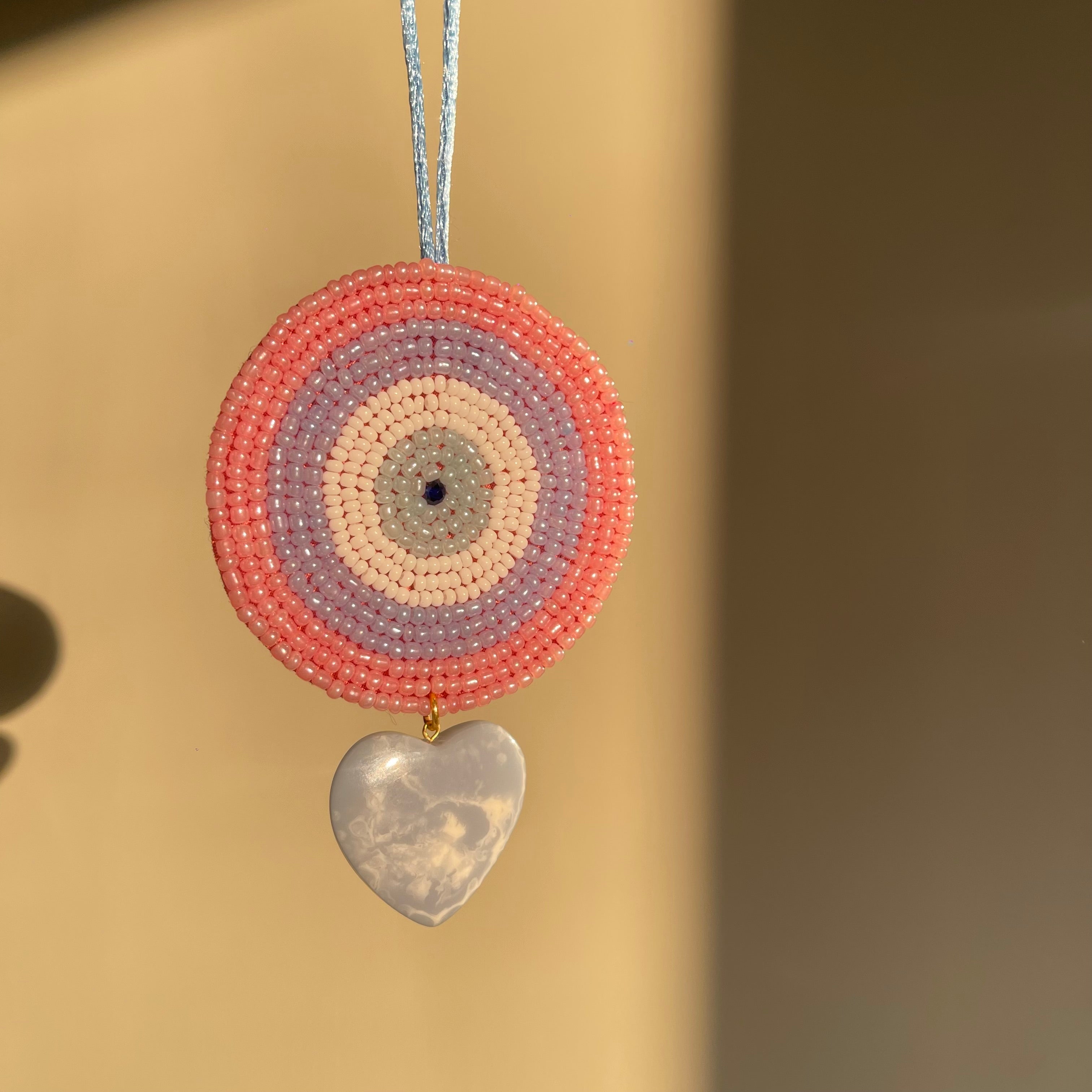 Two part charm with a round hand-beaded evil eye and a max gold glitter HANNAN heart.