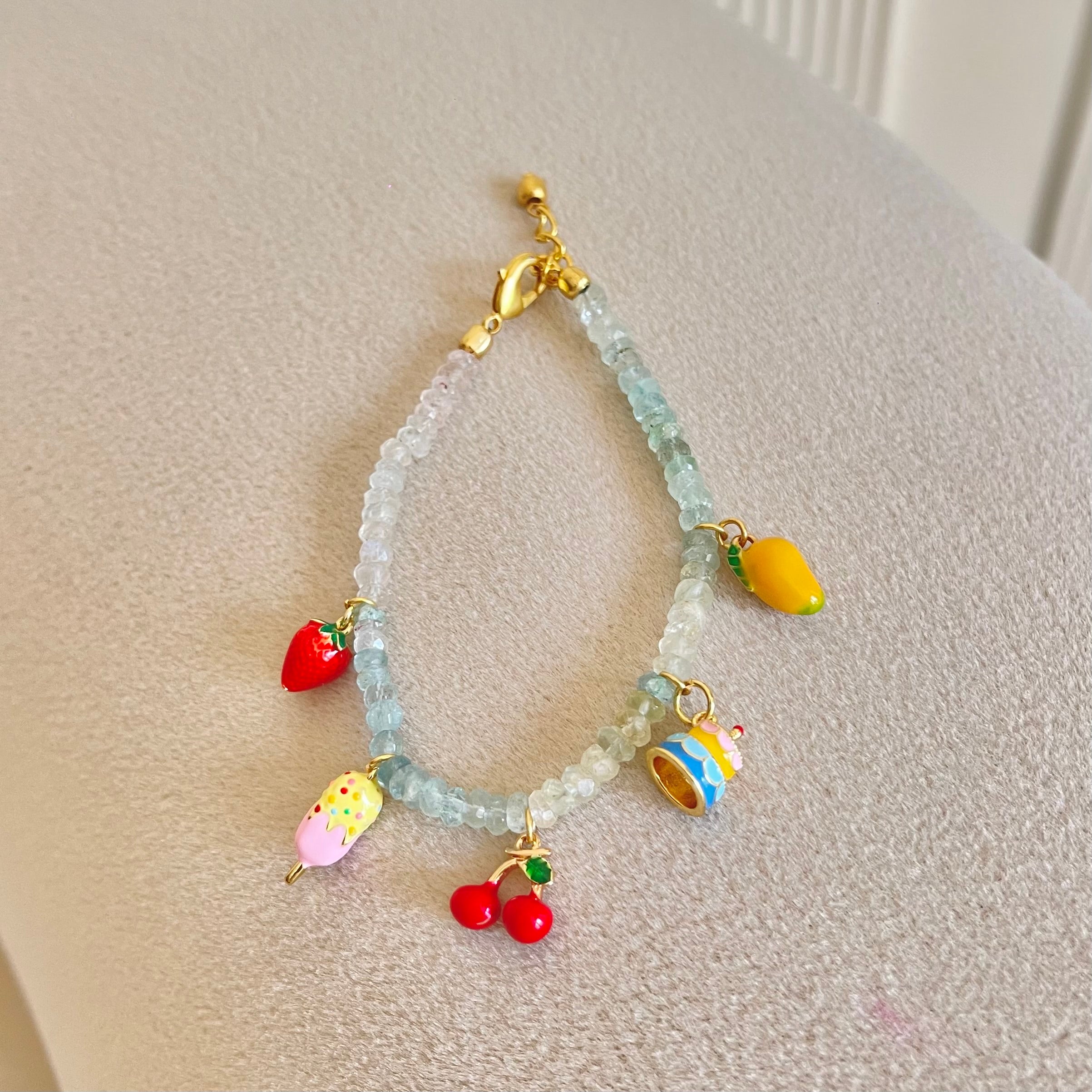 Aquamarine gemstones charm bracelet with enamelled charms - ice cream, cherry, strawberry, birthday cake & mango.