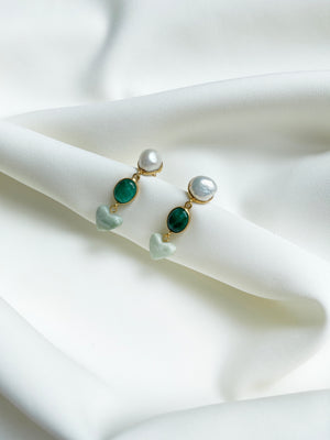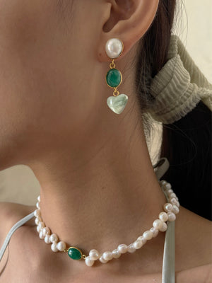 ~ Pearl studs, oval dyed emerald stones & mini sage swirl resin heart charms.
