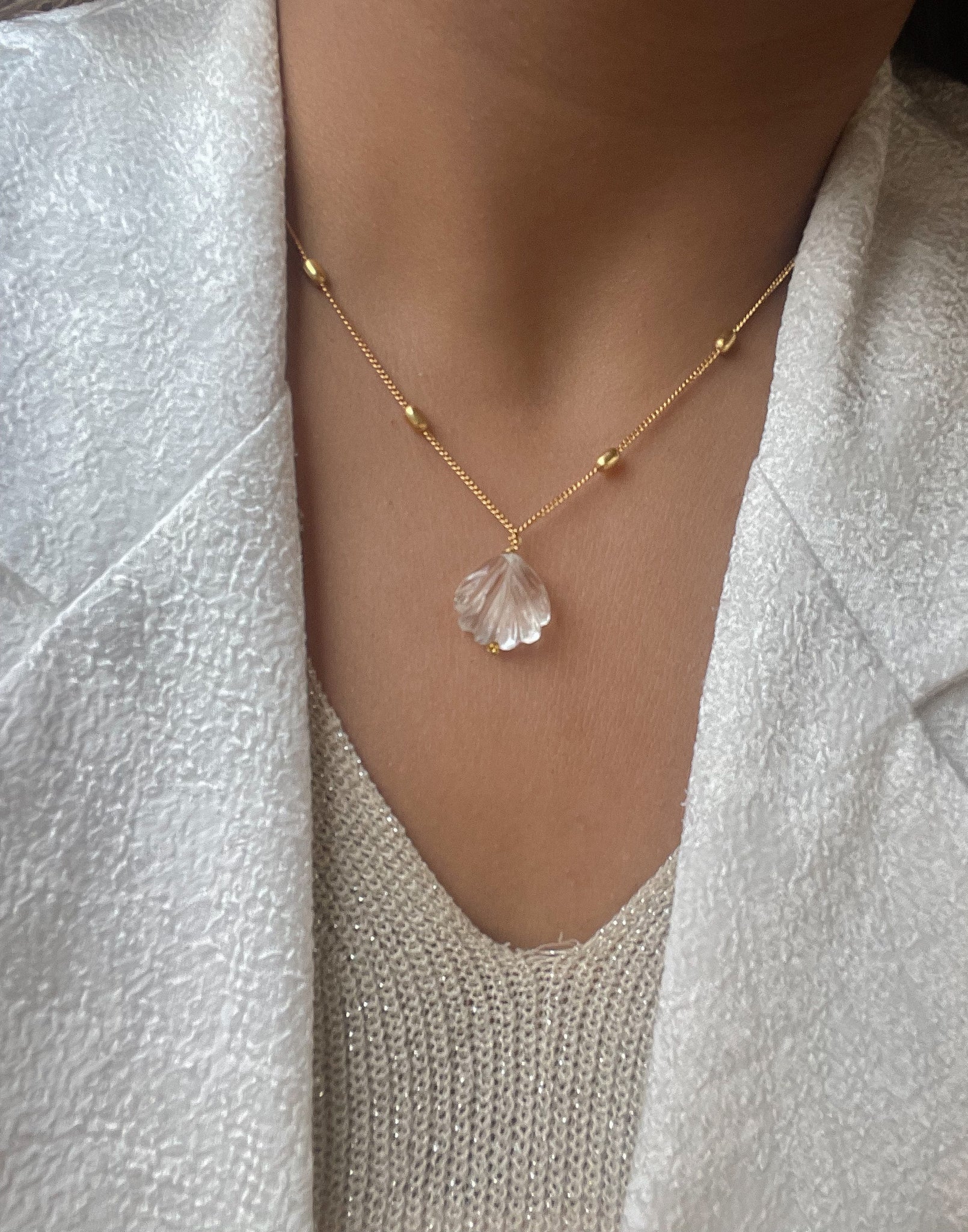 Clear quartz oyster charm on the signature ‘Grain of Truth’ chain.