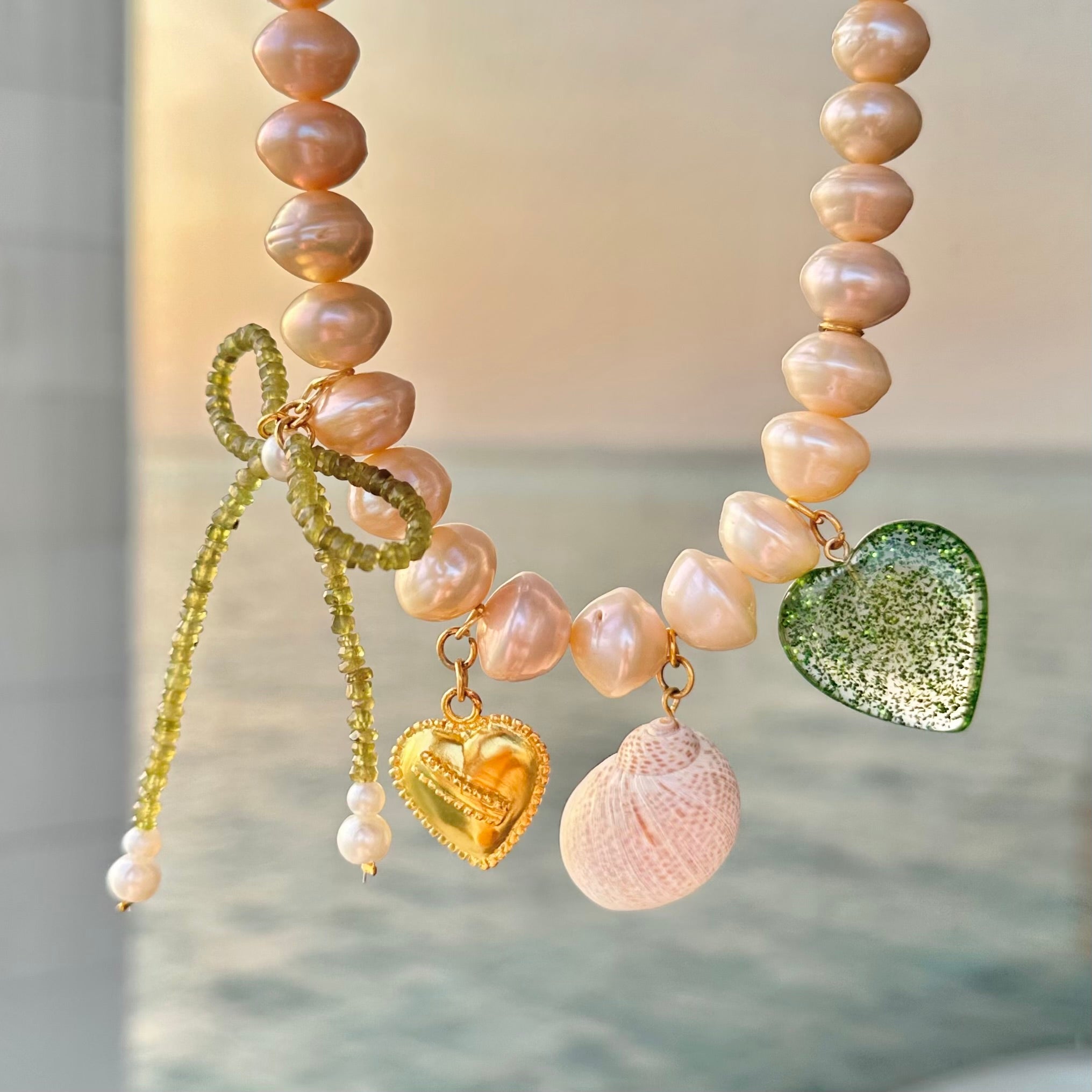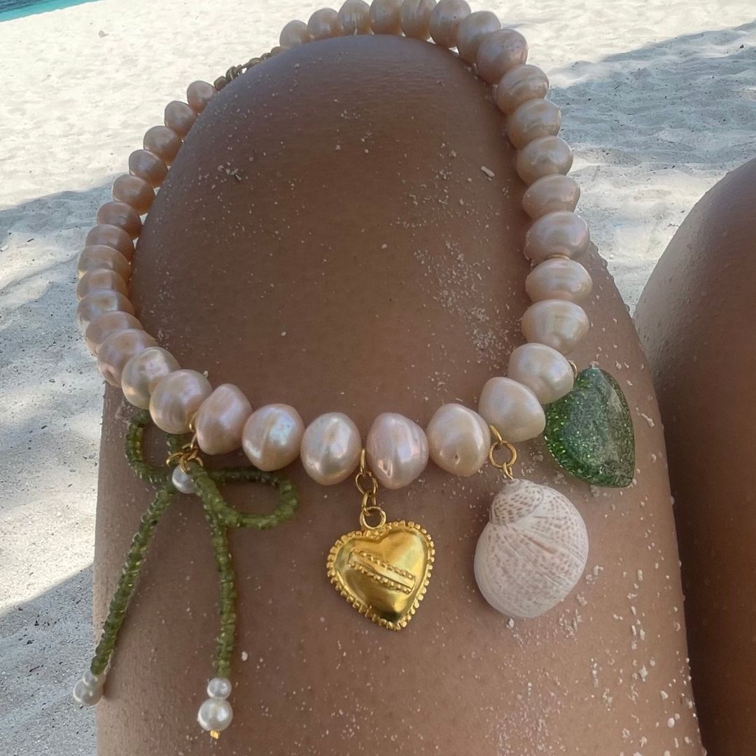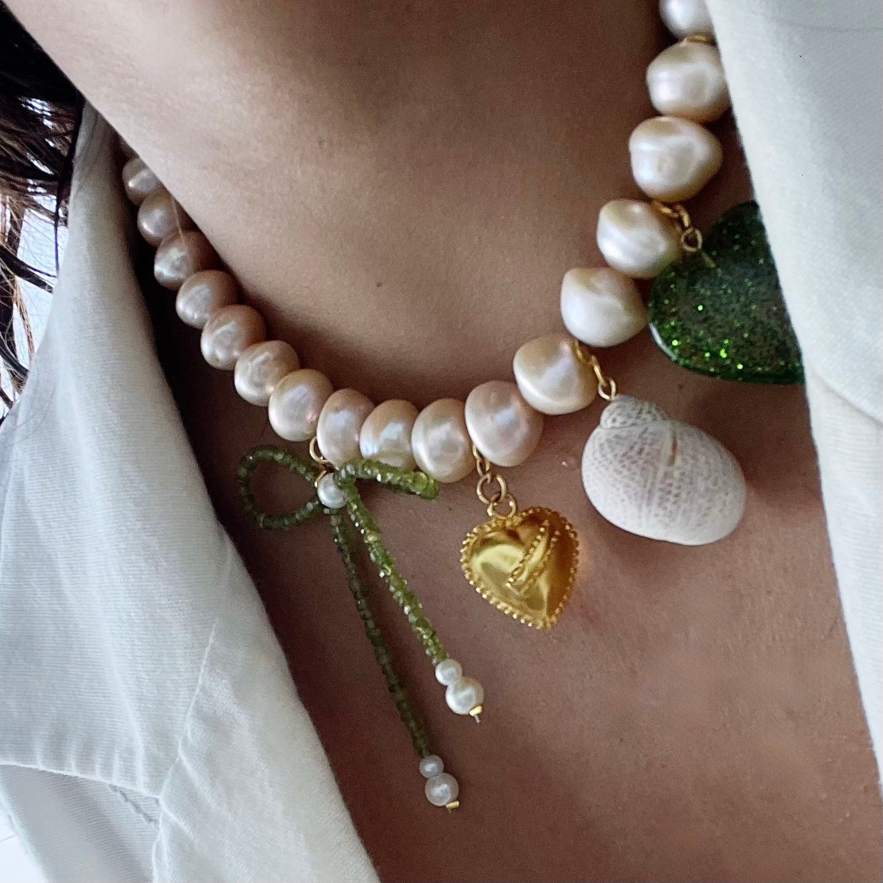 HANNAN signature charms on a chunky freshwater pearls necklace.