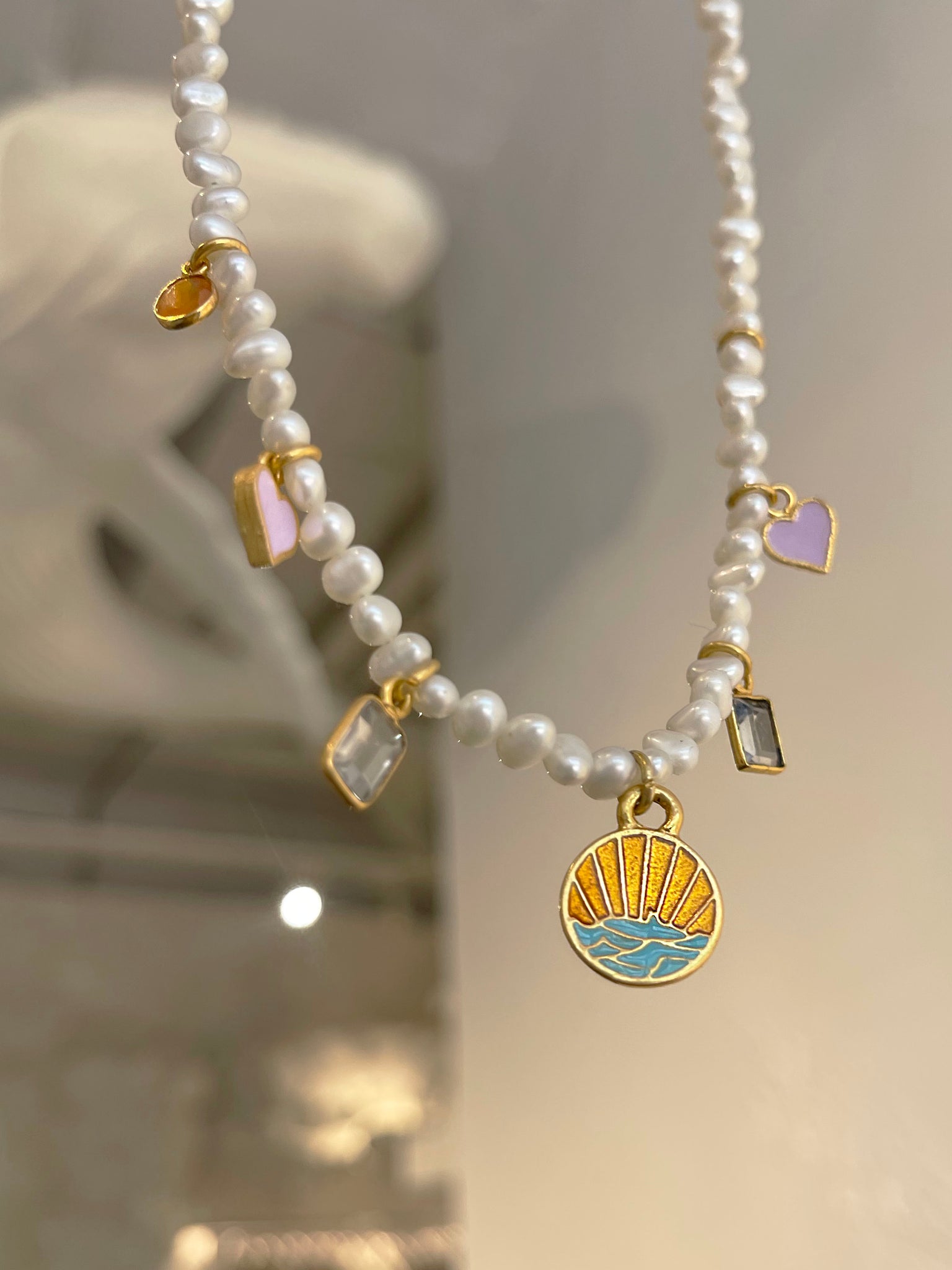 Mini pearls necklace with the Wild & Free coin charm with an enamel filled scenery, semi-precious stones and HANNAN teenie bit hearts.